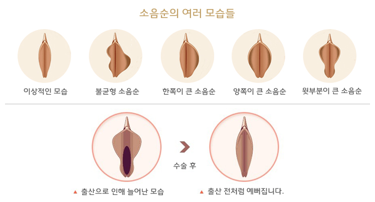 또한 목욕탕 가기가 꺼려지고 때로는 결혼을 앞두고 첫날밤이 염려 되거나 괜한 오해를 받을까 불안감을 느끼는 경우, 그 밖에 양쪽 소음순의 길이가 보기 싫을 정도로 차이가 나는 비태칭일 때 소음순 성형수술을 고려애햐 압니다.
